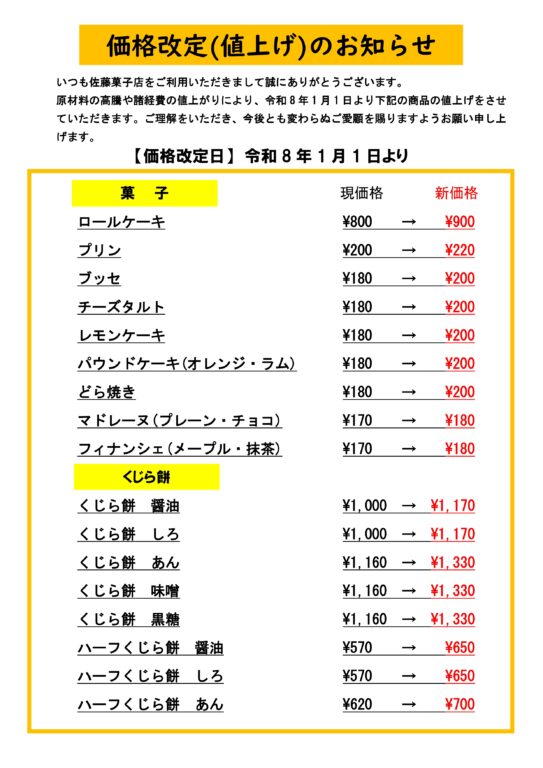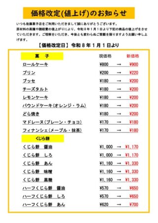 令和8年1月1日より下記の商品の値上げをさせていただきます。